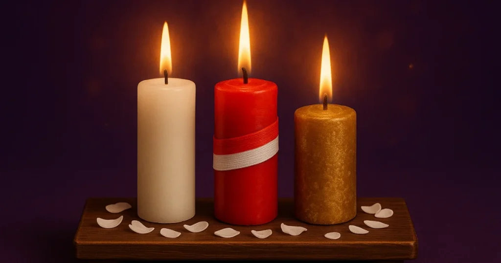 - Velas: Representan la luz y la intención; cada color (rojo, blanco, amarillo) tiene un propósito.